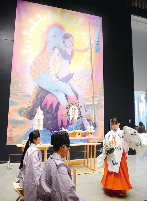 新型コロナウイルス感染の収束が見えない中、来る2021年の安寧を願い、埼玉県所沢市東所沢和田の角川武蔵野ミュージアムで27日、「疫病退散アマビエ之図」のお祓(はら)い式が行われた。