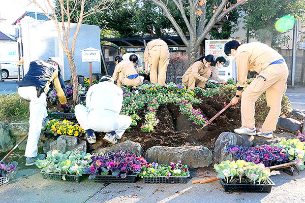 寒さが本格化する中、埼玉県杉戸町役場の花壇が耐寒性の強いパンジーやビオラ、ハボタンに植え替えられ、来館者の目を楽しませている。杉戸農業高校園芸科の生徒らが、栽培した約千鉢の花を植栽。一年草で春先まで楽しめるという。