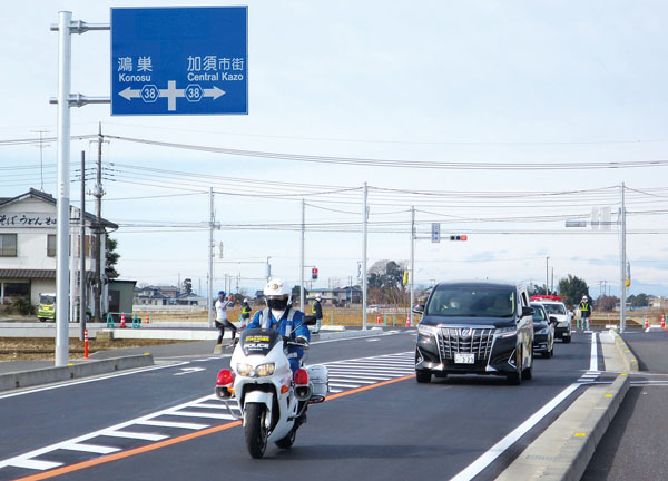 • 県道久喜騎西線バイパスの一部約880メートルが完成し、走り初めが行われた=加須市上高柳の交差点付近