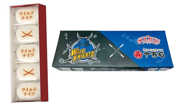 「うまい、うますぎる」のキャッチフレーズで有名な埼玉銘菓「十万石まんじゅう」。今回は「ワイルドナイツ」の文字と、チームのロゴにも使われる刀の焼き印を押した、2種類の十万石まんじゅうを用意。パッケージも限定デザインの包装紙をあしらった。