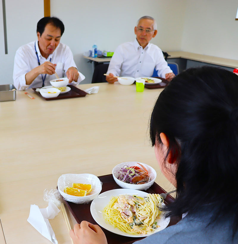 食事をしながら近況を話す卒園生(手前)=4月29日、埼玉県春日部市の「子供の町」