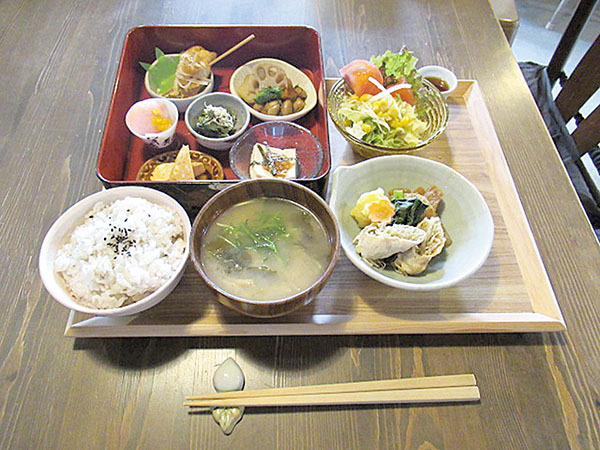 重箱の中は小皿が6皿。串ものにはジャガイモや大根、コンニャクなどがあり、何が提供されるかはその日のお楽しみ。煮物や豆腐、卵料理なども重箱に並び、いろんな料理が少しずつ食べられる。野菜がたっぷり入ったみそ汁は雑穀ご飯を引き立たせ、野菜から季節感が楽しめるのもうれしい。