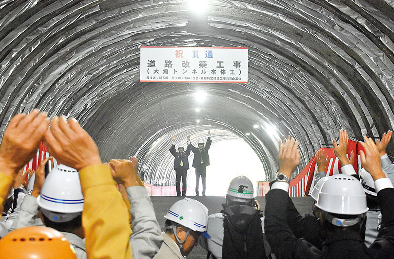 開通は27年!トンネル貫通で“5キロ”ショートカットへ 関越道ICから伸びる延長110キロ“西関東連絡道路”の一部、無事故で喜び 岩盤を爆破する大迫力の見学会もあった 当初予定より5カ月も早く貫通、何があった 2024/05/16/19:03 無事故の貫通成功を祝し、万歳三唱する関係者=15日午前10時半ごろ、秩父市の大滝トンネル この写真の記事に戻る