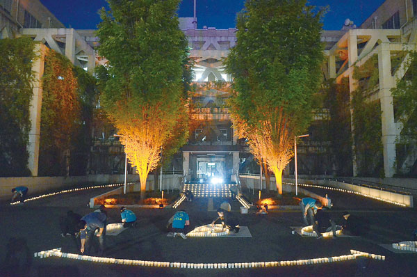 さいたま市浦和区の県庁では18日、埼玉県誕生150周年にちなみ、ろうそくを「150」の文字の形などに灯す「キャンドルナイト」を有志団体「BON!!フェス実行委員会」(久喜市)が実施した。一日がかりで準備した同団体メンバーや梅田修一久喜市長ら約15人は、点火したそばからかき消す強風に悪戦苦闘しながらも、県庁を彩るイルミネーションを完成させた。