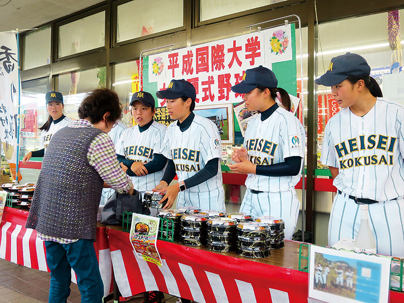 第10回全日本大学女子硬式野球選手権大会で2年連続4度目の優勝を飾った加須市の平成国際大学女子硬式野球部が4日、同市騎西のスーパーまるたけ騎西店で、「アスメシ丼」などの特売セールを行った。同店での凱旋(がいせん)報告は2年連続になる。