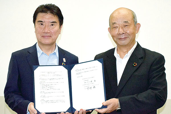 • 連携協定を調印した中村毅理事長(左)と戸ケ崎勤教育長=5月26日、戸田市教育委員会室