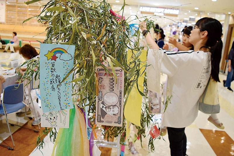 1万円札デザインの短冊で七夕かざり 深谷の商業施設で 来場者が夢や願い書き込む