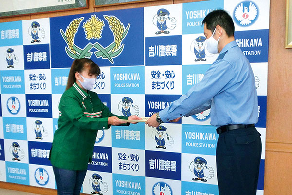 吉川署は24日、電子マネーを使った特殊詐欺被害を未然に防止したとして、セブンイレブン三郷彦成3丁目店オーナーの大矢幸寛さん(38)、アルバイトの古田ユキ江さん(52)に感謝状を贈った。