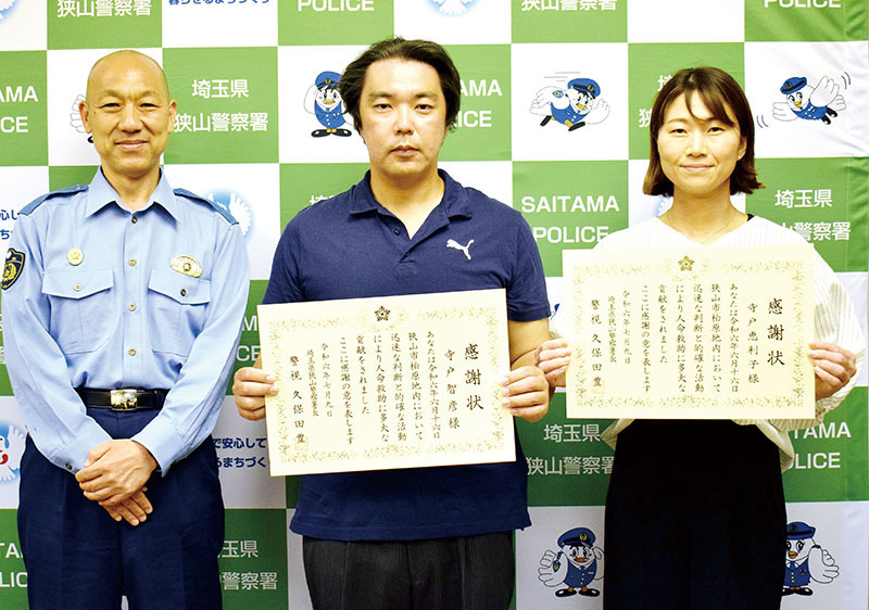 狭山市柏原の入間川にかかる「いるまがわ大橋」から飛び降りようとする女性を救ったとして、狭山署は9日、会社員の寺戸智彦さん(44)とパートの恵利子さん(41)夫妻=同市在住=に感謝状を贈った。同署は「悩んでいる人は、相談ホットラインに打ち明けてほしい」としている。