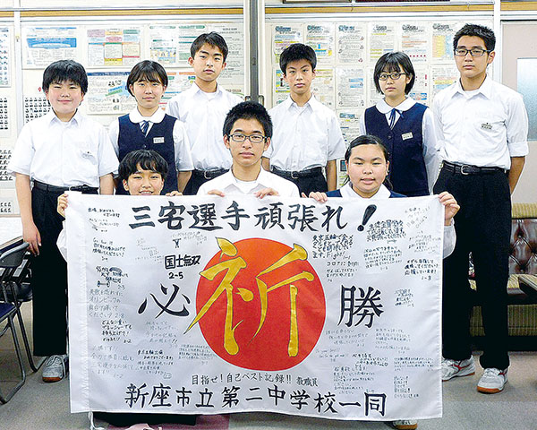 東京五輪・重量挙げの三宅宏実選手の活躍祈念 母校の埼玉・新座の中学校が応援メッセージ、母親に贈呈 2021/07/11/00:00 生徒代表ら27人が応援メッセージを寄せ書きした国旗と生徒ら=新座市野火止7丁目(新座市立第二中学校提供) この写真の記事に戻る