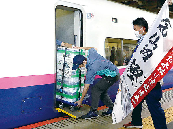 気仙沼の新鮮な魚が海なし県埼玉に届いた! 16日午後、JR大宮駅新幹線ホームに到着した宮城県気仙沼市産のカツオは、駅東口の「まるまるひがしにほん」で、列を作って待ちわびていた客に販売された。この日運ばれたカツオは15本分。1本を4分割した「カツオのたたき」60パック(1パック900円税込み)は、約5分で完売した。