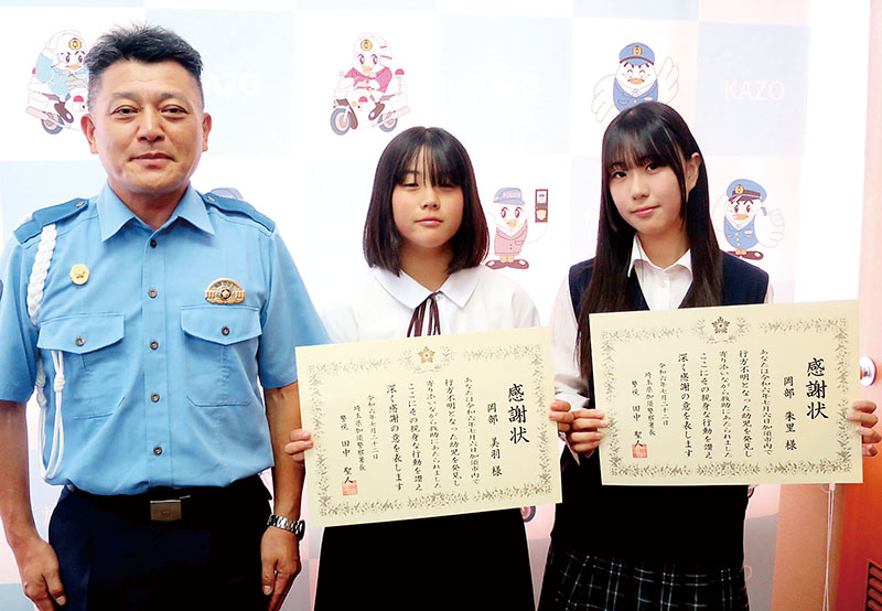 泣く3歳女児、汗だくで母を探す…スーパーへ行こうとし迷子に 交通量が多い道 女子高生と女子中学生の姉妹、女児を発見し抱っこ…家に送り届ける 心配で自宅前にいた祖母が涙 母は買物でなく仕事に向かっていた 2024/07/24/10:35 迷子の女児を保護した高校生と中学生の姉妹に感謝状が贈られた。左から田中聖人署長、岡部美羽さん、岡部朱里さん=加須署 この写真の記事に戻る