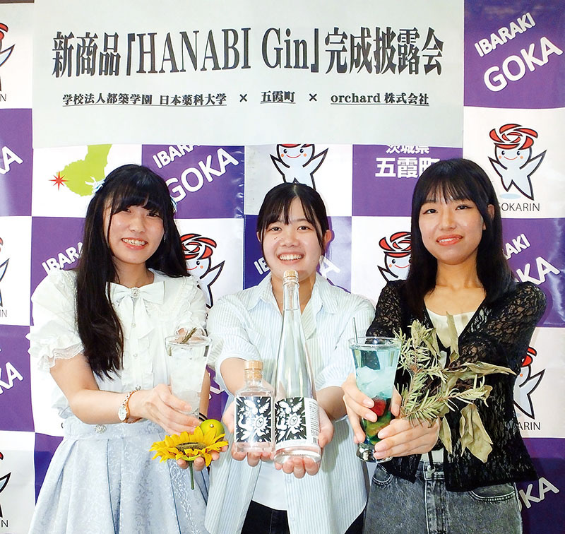 伊奈町の日本薬科大学と茨城県五霞町、町内蒸留所の産学官連携プロジェクトから生まれたクラフトジン「HANABI Gin(ハナビ ジン)」の完成披露会が5日、町役場で開かれた。薬科大生が企画段階から携わり、若い女性をターゲットにしたフルーティーな酒を開発。町の新たな特産品として、9月14日に町内で開催される利根川大花火大会で売り出す。
