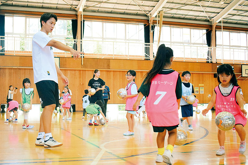 1年生はボールを投げてキャッチしたり、シュートをしたりして運動を楽しんだ。福西さんと三木さんが手本を見せると、「すごい」「上手」と歓声が上がった。
