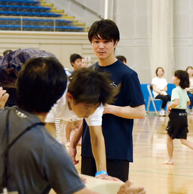 現役時代にロンドン、リオデジャネイロの両五輪で、体操男子個人総合を2連覇した内村航平さんを招いた体操イベントが18日、熊谷市上川上の彩の国くまがやドームで開かれた。市内でスタンドアップ体操教室を運営するアスリィと、熊谷スポーツ文化公園が主催。市内外の小中学生計80人が参加した体操教室や、トークショーを行った。