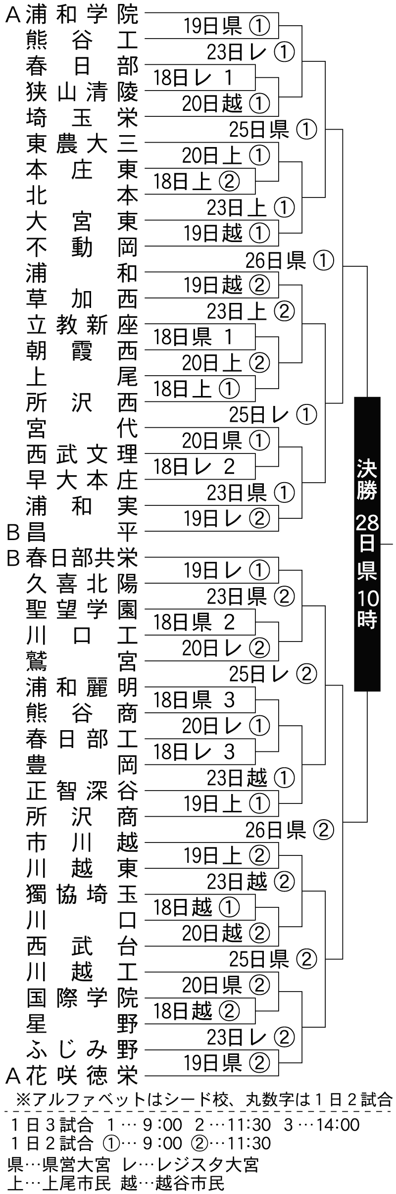 抽選会では、本抽選の前に県大会出場校によるシード校(A、Bシード)を選ぶ投票を行い、Aシードは今夏の全国高校野球選手権大会に出場した浦和学院が35票で第1シードの位置に決定。花咲徳栄が34票で第2シードの位置に入った。Bシードには、26票の春日部共栄と24票の昌平が選出され、抽選により、春日部共栄が花咲徳栄ゾーンに、昌平が浦和学院ゾーンに収まった。