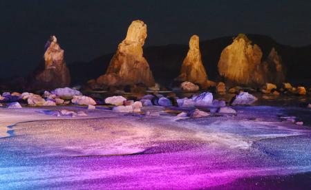和歌山の奇岩、恒例ライトアップ 天然記念物「橋杭岩」、串本