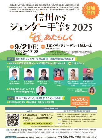 長野からジェンダー平等の実現を 9月にシンポジウム、地方初開催
