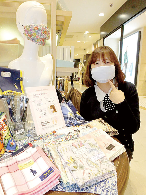 <新型肺炎>手軽な「ハンカチマスク」、八木橋で販売 1分でハンカチがマスクに変化 柄の見せ方も変更可