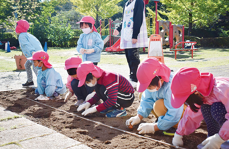 園児たちは今回、ステンドハウス南側の約25平方メートルの花壇に約千個の球根を植えた。深さ約8センチの植え穴に、各自の好きな色の球根を落とし、丁寧に土をかぶせた。