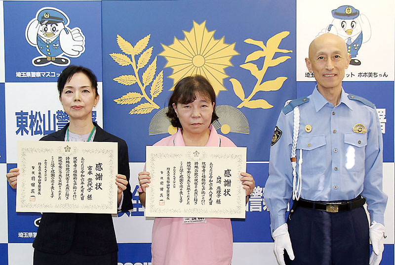 特殊詐欺を未然に防いだとして、埼玉県の東松山署は9月26日、JA埼玉中央の訪問介護士の山崎恵理子さん(60)と、埼玉りそな銀行東松山支店川島町出張所に勤務する会社員の宮本貴代子さんに感謝状を贈呈した。