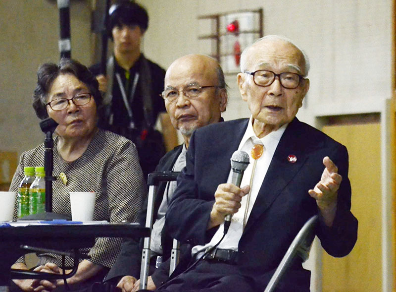 講演で核廃絶への思いを訴える田中熙巳さん(右)と被爆者の高橋溥さんと木内恭子さん=16日午後、さいたま市浦和区の県立浦和高校