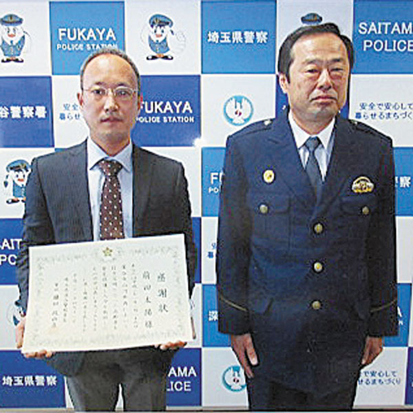 人命救助に貢献したとして深谷署(鎌田政由喜署長)は、本庄市の大学准教授、前田太陽さん(42)に感謝状を贈呈した。