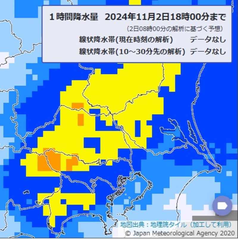 【速報】埼玉で急な強い雨、落雷に注意 大雨警報の可能性も 24時間で所により80ミリの雨予想 2024/11/02/06:28 2日午後6時の雨の予想図(気象庁HPから) 2日午後9時の予想天気図(気象庁HPから) この写真の記事に戻る