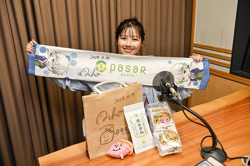 パサール羽生、パサール三芳のグッズや商品とともに笑顔の渡邉さん