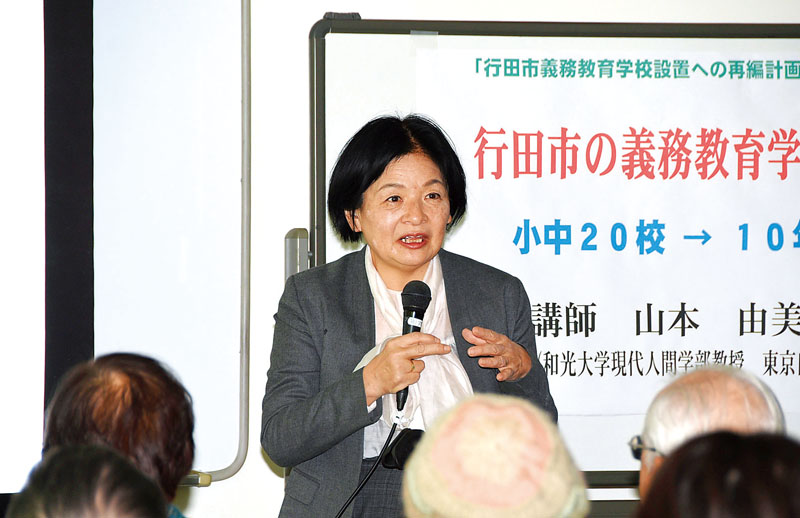 行田市が発表した市立小中学校の再編方針に反対する市民有志がつくる「行田市義務教育学校設置への再編計画」を考える会は、同市佐間の教育文化センター「みらい」で、和光大学の山本由美教授を招いて講演会を開いた。会場には約100人が来場。学校の統廃合が及ぼす影響について研究している同教授は、「子育てのインフラがなければ、まちに子どもは増えない」と懸念を示した。