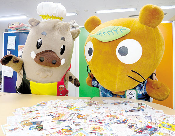 ムジナもんたちに年賀状、全国各地から250通 羽生市の姉妹都市のキャラ、イノシシの「デュリぼう」にも
