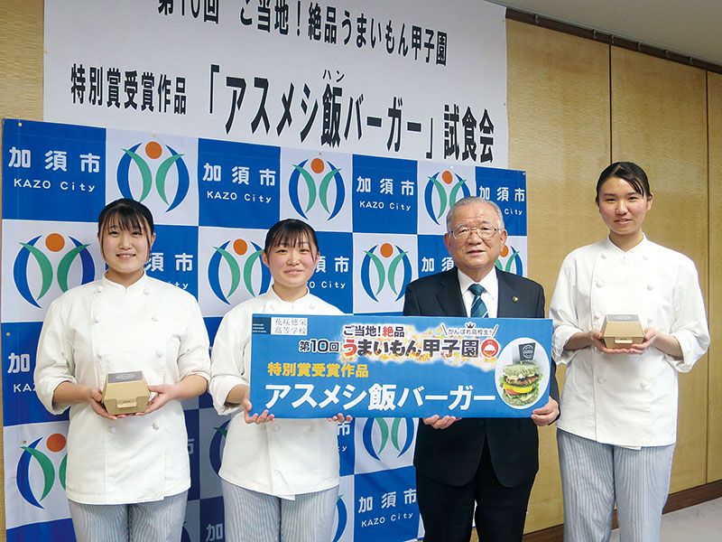花咲徳栄高校食育実践科が開発した「アスメシ飯(ハン)バーガー」の試食会と一般販売会が加須市役所で開かれ、大橋良一市長らが試食した。昨年11月に東京・二子玉川ライズで開かれた「第10回ご当地!絶品うまいもん甲子園」の決勝大会で特別賞を受賞したライスバーガー。大橋市長らは味わいながら功績をたたえた。