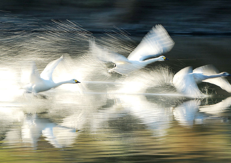 厳冬の朝 響く羽音 「冬の使者」コハクチョウ50羽確認