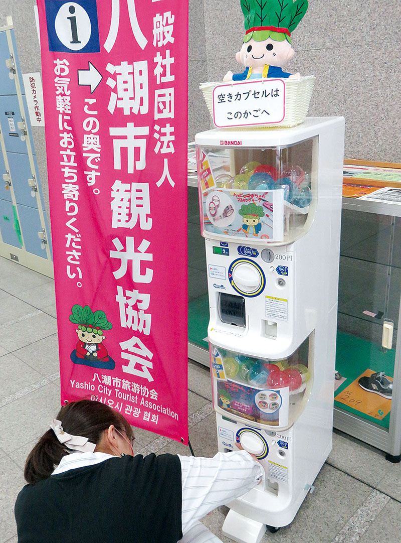 八潮市マスコットキャラクター「ハッピーこまちゃん」のカプセル玩具(通称ガチャガチャ)が4月から、つくばエクスプレス八潮駅前の市観光協会にお目見えした。
