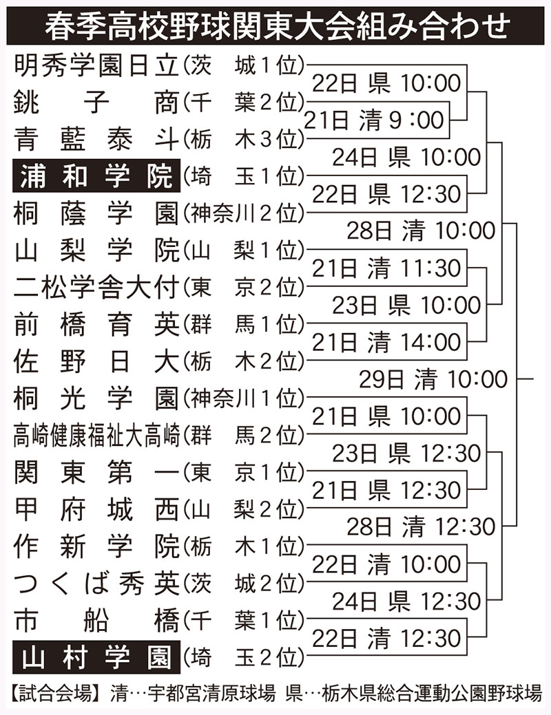 <高校野球>山村学園 シード勢下し3年ぶり関東 先制が勝利の鍵 3番坪井、4番酒井に期待 2022/05/21/00:00 高校スポーツ 打率4割1分4厘、12安打12打点でチームをけん引する山村学園の4番酒井 春季関東大会組み合わせ 高校野球の第74回春季関東大会は21日、栃木県の宇都宮清原球場、栃木県総合運動公園野球場で1都7県から17校が参加して開幕する。 もっと読む ツイート シェア シェア スポーツの記事一覧 埼玉新聞のHOMEに戻る