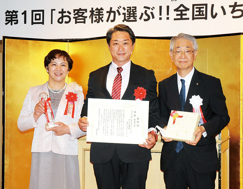 • 1位に輝いたただかね農園の高野宏昭さん(中央)と妻奈美子さん。右はコロンバンの萬場稔専務=10日午前、東京都港区の明治記念館