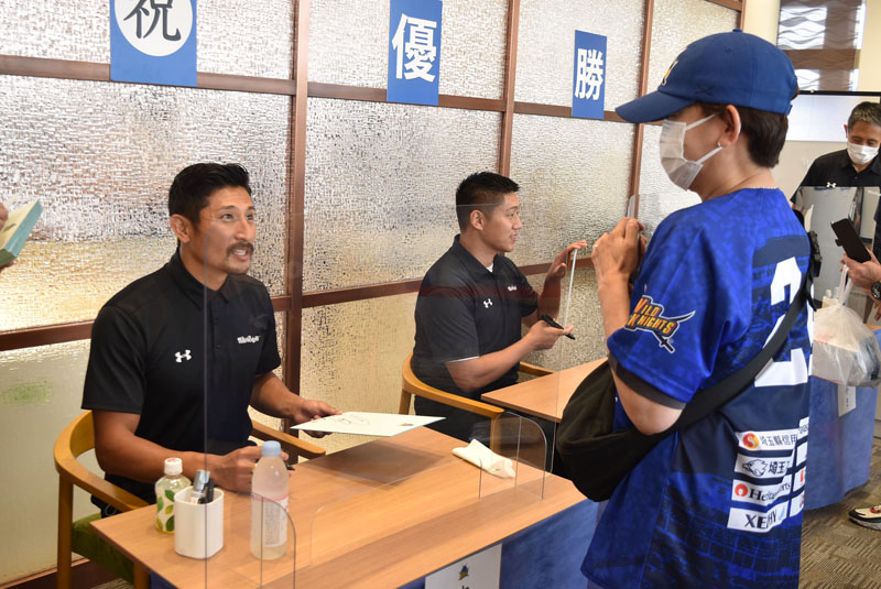 • ファンの前でサイン会を行う(左から)内田啓介選手や谷昌樹選手=18日午後0時15分ごろ、熊谷市箱田の梅林堂箱田本店