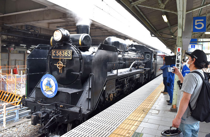• 特別ヘッドマークを掲げ、出発する「SL埼玉パナソニックワイルドナイツエクスプレス」=18日午前10時10分ごろ、熊谷市桜木町の秩父鉄道熊谷駅