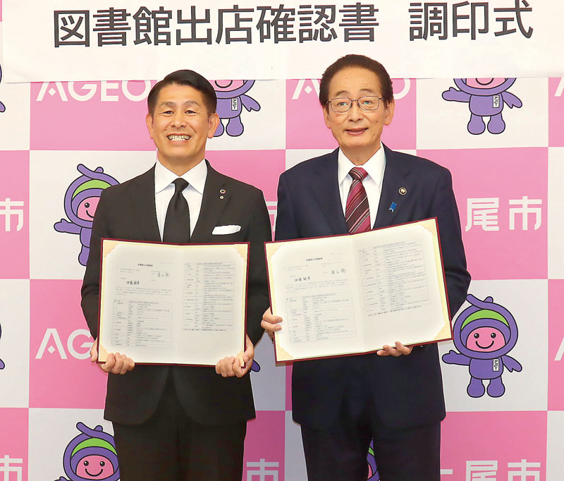 上尾市と丸広百貨店(本社・川越市)は、同社上尾店への市立図書館(上町)の仮本館設置について正式に合意した。15日に行われた調印式では、畠山稔市長と伊藤敏幸社長が「図書館出店確認書」に署名。これにより、本館の大規模改修中も、図書館機能が継続できることになった。また本館工事終了後もJR上尾駅前の好立地を生かし、分館として活用することで市民サービスの向上を図る。仮本館のオープンは2026年度中を予定している。