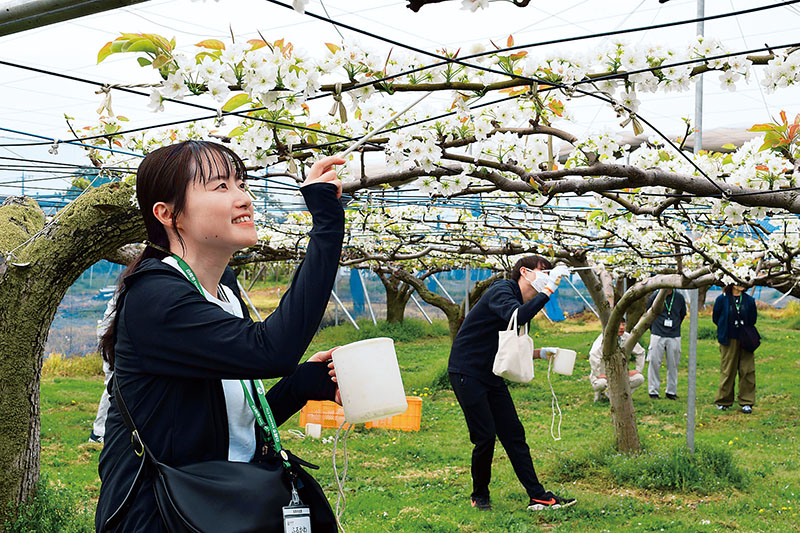 「白岡美人」のブランドで知られる特産のナシへの理解を深め業務に役立ててもらおうと、埼玉県の白岡市は18日、新規採用職員12人を対象にナシの人工授粉作業「花掛け」体験を実施した。