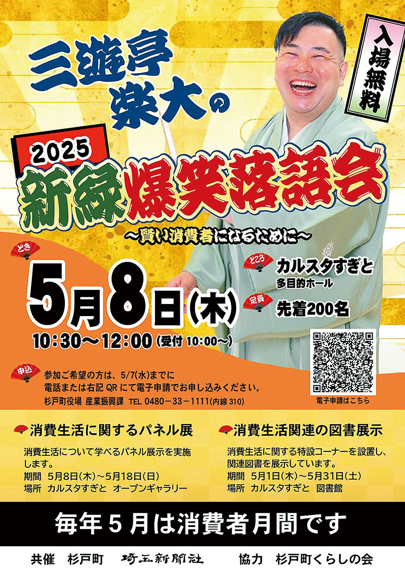 毎年5月の消費者月間に合わせ、杉戸町は5月8日、カルスタすぎと多目的ホールで、落語家の三遊亭楽大氏=草加市出身=による「新緑爆笑落語会~賢い消費者になるために~」(埼玉新聞共催)を開催する。