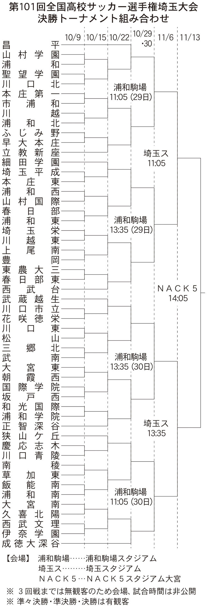 サッカーの第101回全国高校選手権埼玉大会(埼玉新聞社など後援)は9日、52校による決勝トーナメントが開幕する。決勝は11月13日にNACK5スタジアム大宮で行われ、優勝校が全国高校選手権の出場権を手にする。第1シードの昌平と第2シードの成徳大深谷は3回戦から、その他のシード校は2回戦から登場する。今大会は新型コロナウイルス感染拡大防止の観点から3回戦まで無観客で実施。準々決勝以降は一般公開する。