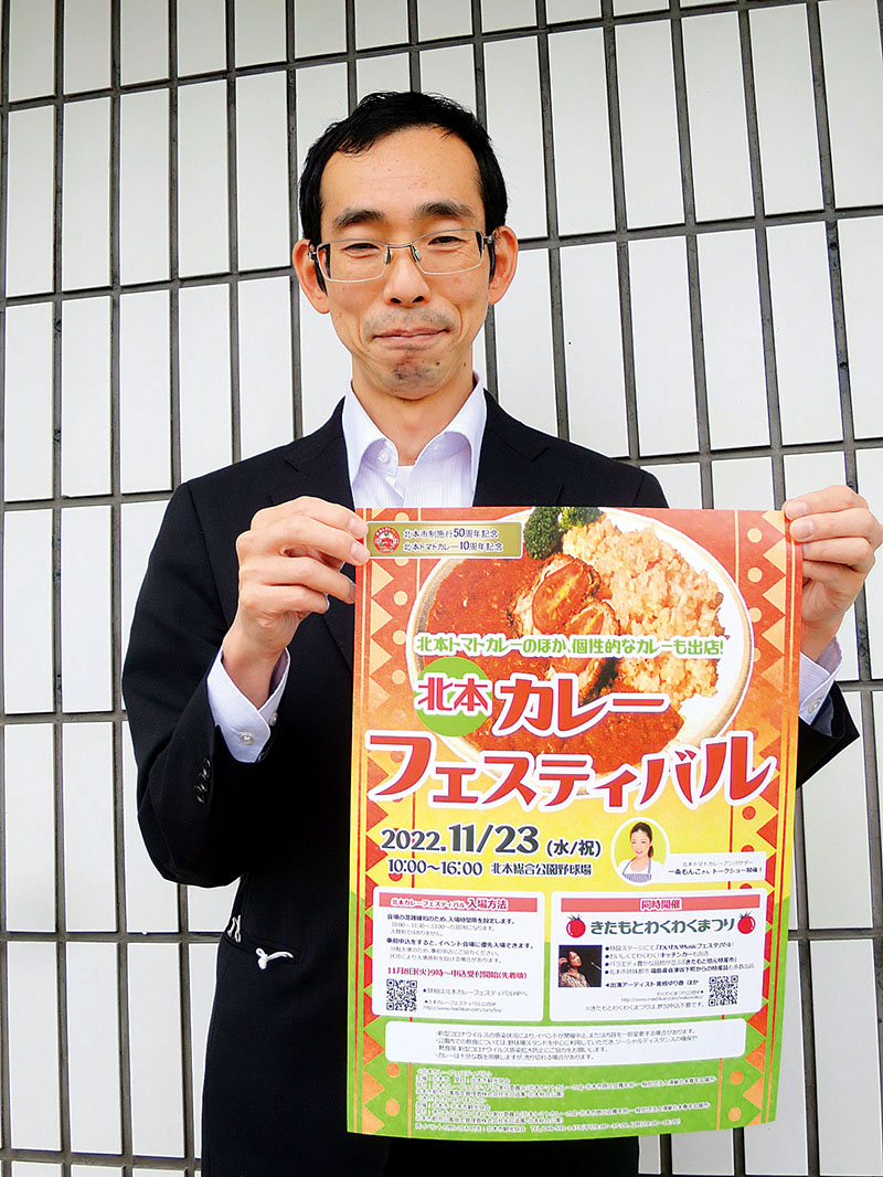 • 「北本カレーフェスティバル」のポスターを持つ北本市観光協会の小松政毅事務局長