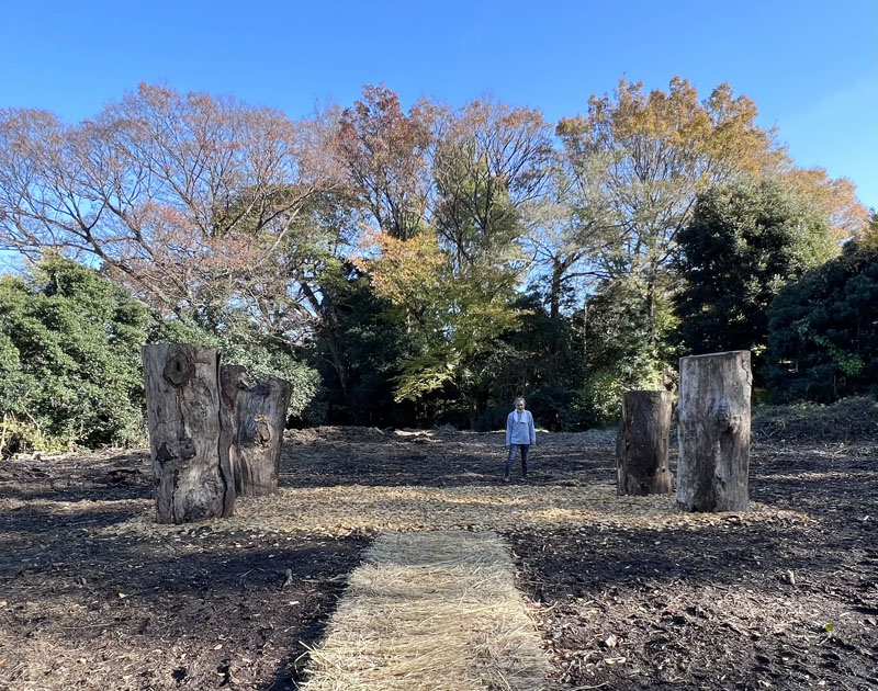 和紙造形作家の柳井嗣雄さん(69)=飯能市=は、「樹といのち」を制作した。イチョウの葉を敷き詰め、大きなケヤキの丸太4本を据えた。束ねたわらを道に見立て、観客を誘導する。自然にある素材を活用した。柳井さんは「木やわらは時間とともに朽ちて土に還(かえ)る。素材そのものの存在感を表した」と語った。