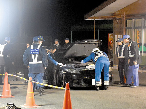 • 不正改造車両を取り締まる警察官ら=9日午後11時半ごろ、西武秩父線正丸駅前(画像を一部加工しています)