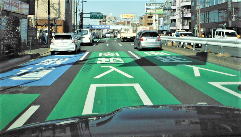 • 高速道の案内は緑色で、一般道は青色で色分けされて、見やすくなった関越道練馬インターチェンジにつながる目白通りの路面表示(県警高速隊提供)