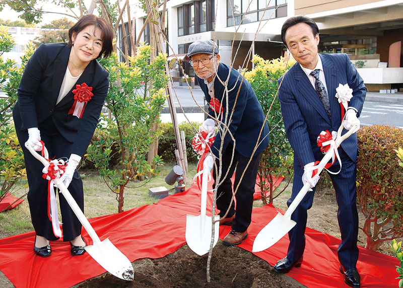 朝霞市は、同市役所庁舎前の緑地「花の池テラス」に、関西地方で新たに発見されたサクラの野生種「クマノザクラ」の苗木2本を植樹した。市の都市緑化の推進などを相互協力する「みどり豊かなまちづくりのための包括連携協定」を締結した公益財団法人「都市緑化機構」(横張真理事長)が寄贈した。都市緑化の調査研究に貢献するとともに、市民らに多様な花木を観賞する環境を提供するのが狙い。