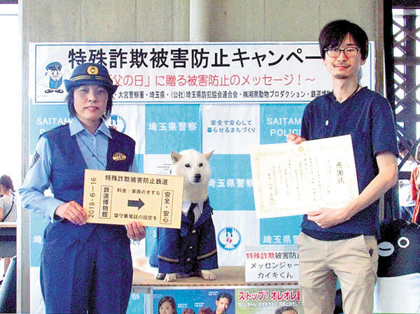 家族の絆で特殊詐欺被害を防止しようと、県警は「父の日」の16日、さいたま市大宮区の鉄道博物館前でキャンペーンを実施した。携帯電話のCMで知られるお父さん犬「カイキ君」を特殊詐欺被害防止メッセンジャーに委嘱し、来場者に啓発品を配るなどして被害に遭わないよう注意を呼び掛けた。