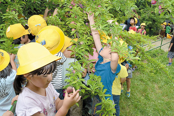 手が届かない1年生には教諭の冨樫もりえさんが、太い枝にぶら下がって枝を下げて「ハイ取ってぇー」。子どもたちが一斉に枝に群がって手を伸ばした。