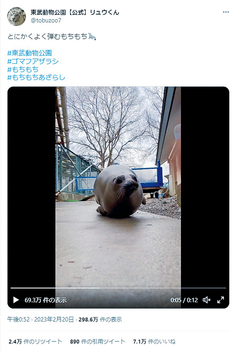 2月には東武動物公園(@tobuzoo7)が投稿した、ボールのように弾みながらカメラに迫るゴマフアザラシ「もちもち」の姿に注目が集まった。ツイッターで7万9千件の「いいね」を獲得。ティックトックにも投稿すると再生数は100万回超に上った。